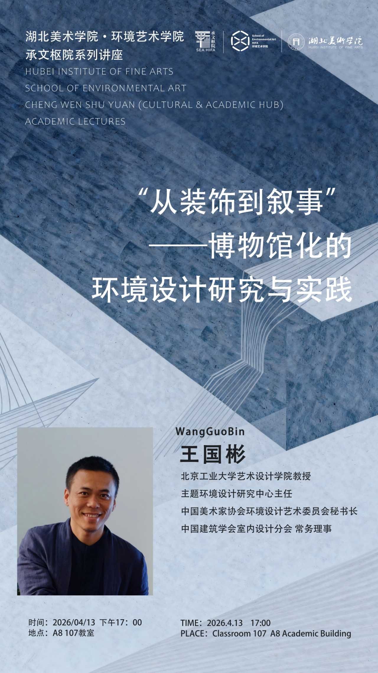 为推动环境设计学科前沿理念与实践经验深度融合,助力学科发展与人才培养,4月13日下午,环境艺术学院承文枢院系列讲座在A8-107教室举行。本次讲座邀请北京工业大学艺术设计学院教授、中国美术家环境艺术委员会秘书长王国彬教授担任主讲嘉宾,他以“‘从装饰到叙事’——博物馆化的环境设计研究与实践”为主题,为学院师生带来了一场兼具理论深度、实践广度与文化温度的学术盛宴。环境艺术学院部分师生参加讲座,讲座由环境艺术学院院长何凡主持。