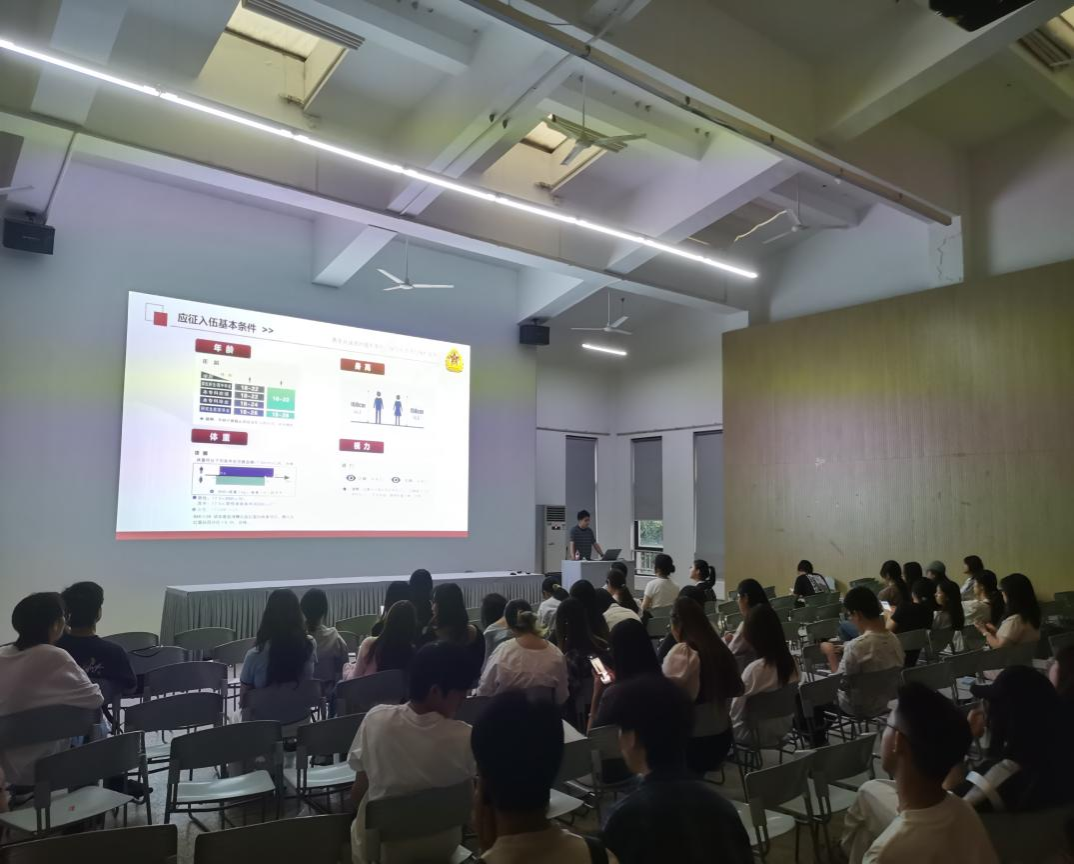 党委学生工作部乐立重点讲解了大学生应征入伍的优惠政策与发展路径,从优先征集、学费补偿、升学优惠到就业安置,一系列政策为毕业生打通了“校门”到“军营”再到“社会”的可持续发展通道。他鼓励大学生们积极应征入伍,履行公民光荣义务,也为自己打开一片成长成才的广阔平台。