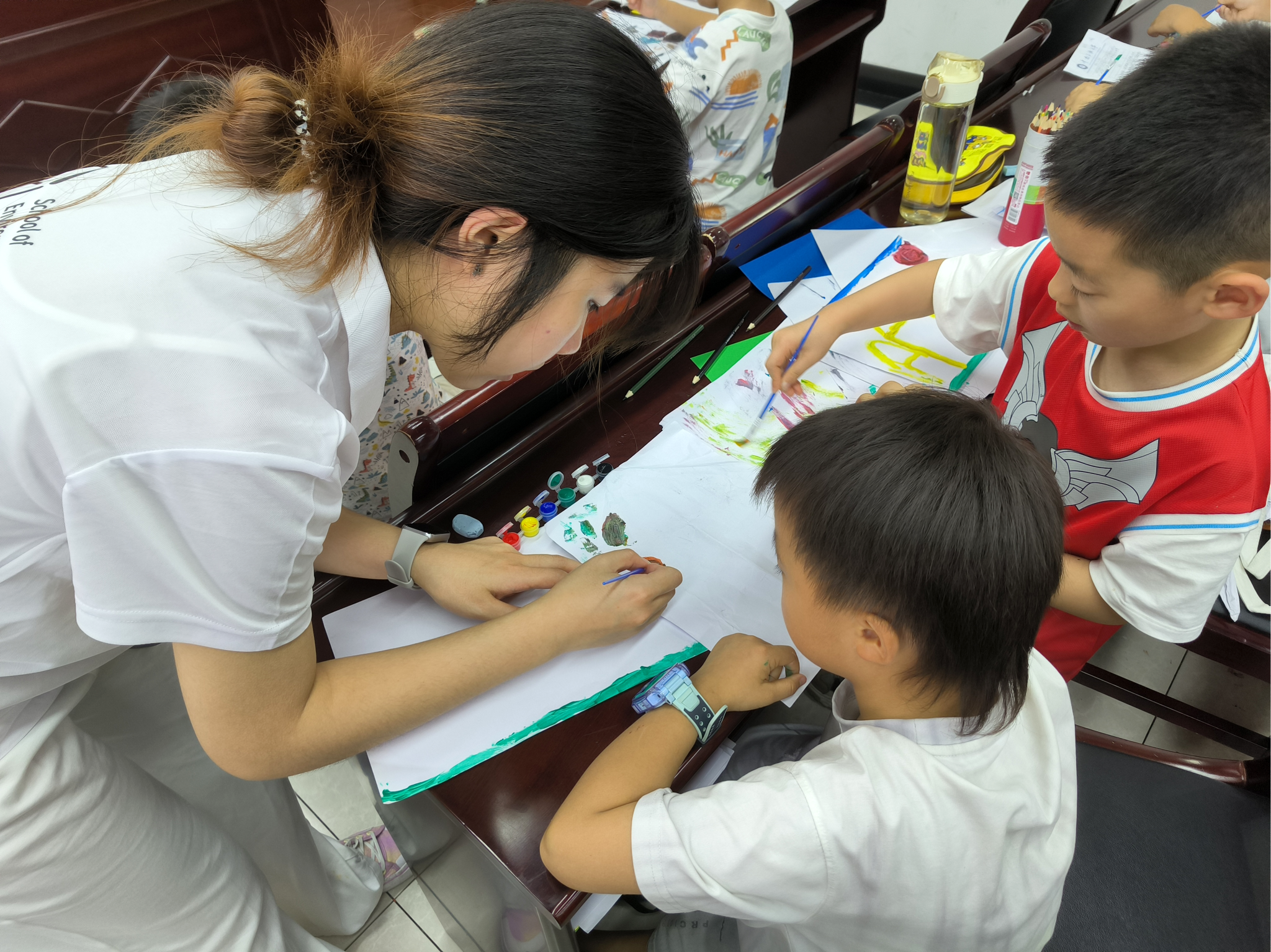 手绘辅导课中,支教队员通过耐心讲解与实操指导,帮助孩子们打破思维局限、激发创作灵感。孩子们纷纷将生活里的乡野所见融入画作:用浓绿线条勾勒出竹林的蓬勃生机,以橙红颜料晕染晚霞的绚烂光影,更将极具地域特色的土家族吊脚楼,描绘成充满童趣的童话城堡。稚嫩笔触与大胆色彩的奇妙碰撞,让每一幅作品都散发着独特的艺术魅力,成为孩子们对家乡的生动“画像”。