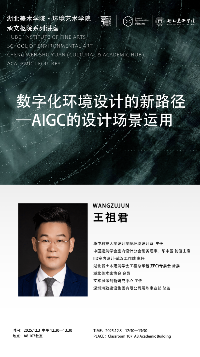 为顺应数字化变革与教育创新趋势,推动设计教育与前沿科技深度融合,12月3日下午在A8-107教室,环境艺术学院邀请华中科技大学设计学院环境设计系主任王祖君教授以“数字化环境设计的新路径——AIGC的设计场景运用”为主题开展学术讲座。环境艺术学院教师参加讲座,讲座由环境艺术学院院长何凡主持。