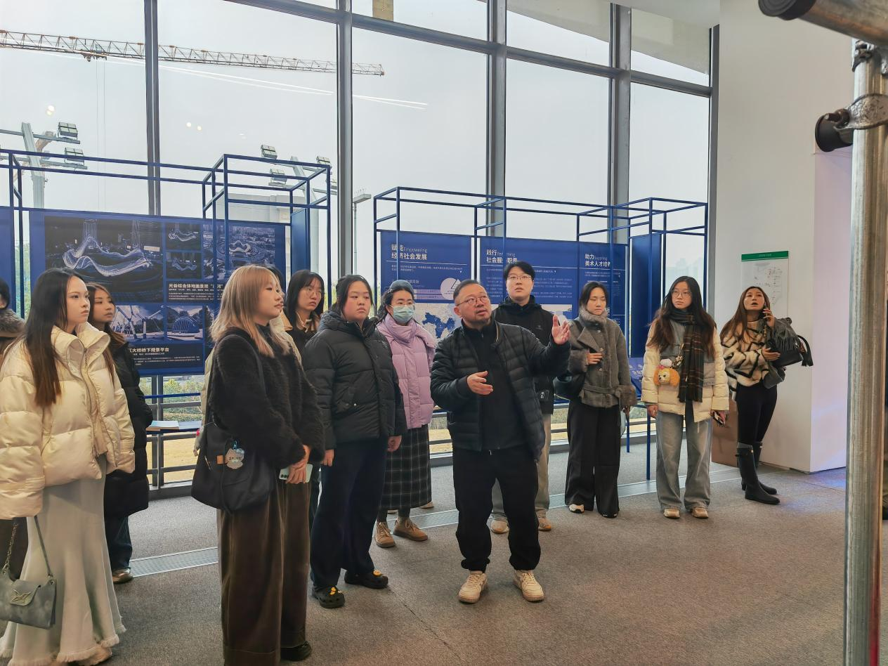 聚焦学院专业特色,师生们观摩了环境艺术学院作品展区。从早期长江大桥纹样投标手稿到米兰国际设计周、大阪世博会参展作品,从传统范式重构研究到现代建筑方案落地,一系列展品清晰勾勒出学院在环境设计、建筑规划等领域的深厚积淀与创新突破。何凡指出,建筑设计不仅是空间的营造,更需兼顾功能与实效,勉励同学们在未来的设计实践中坚持以人为本,注重细节打磨,努力实现设计美学与实用功能的完美统一。